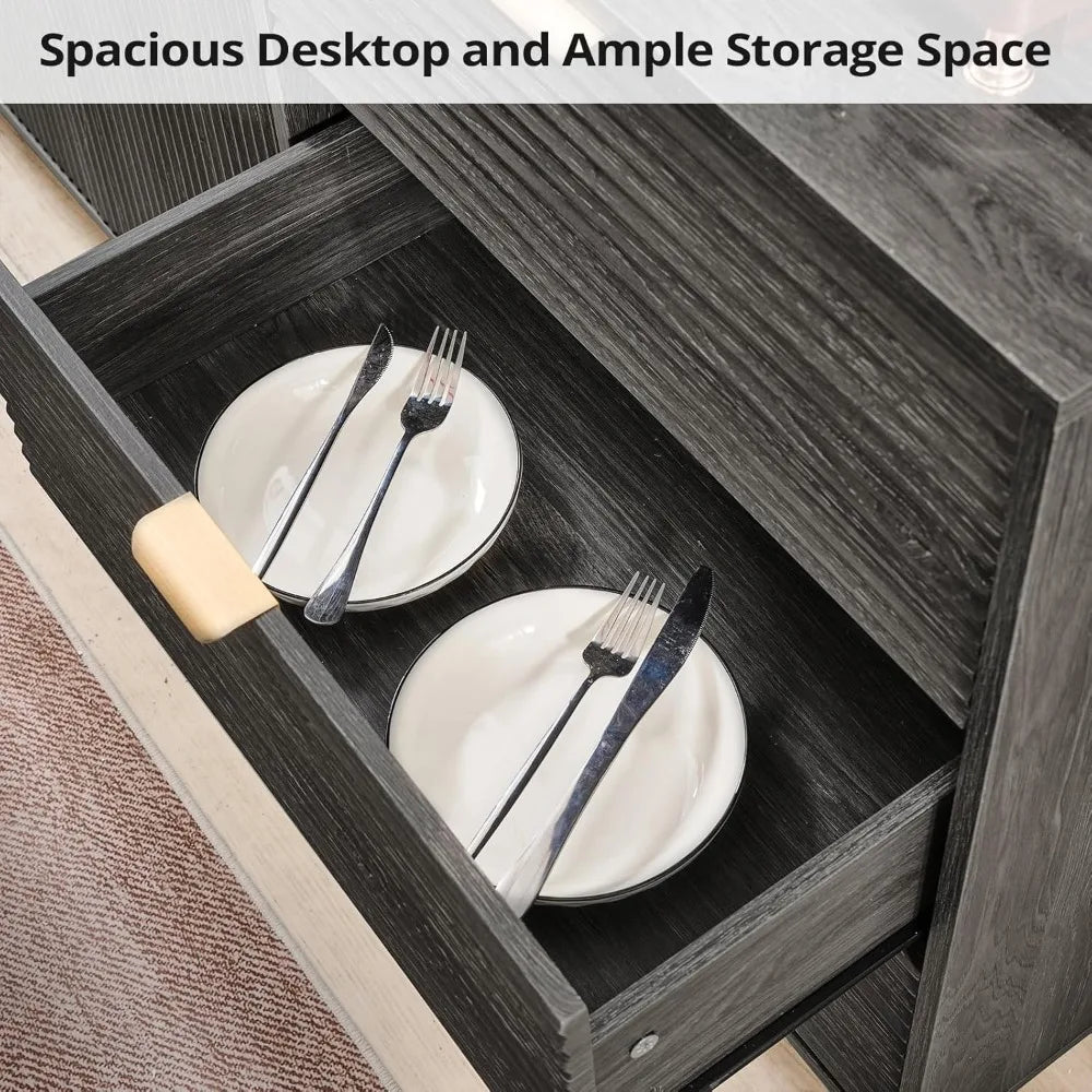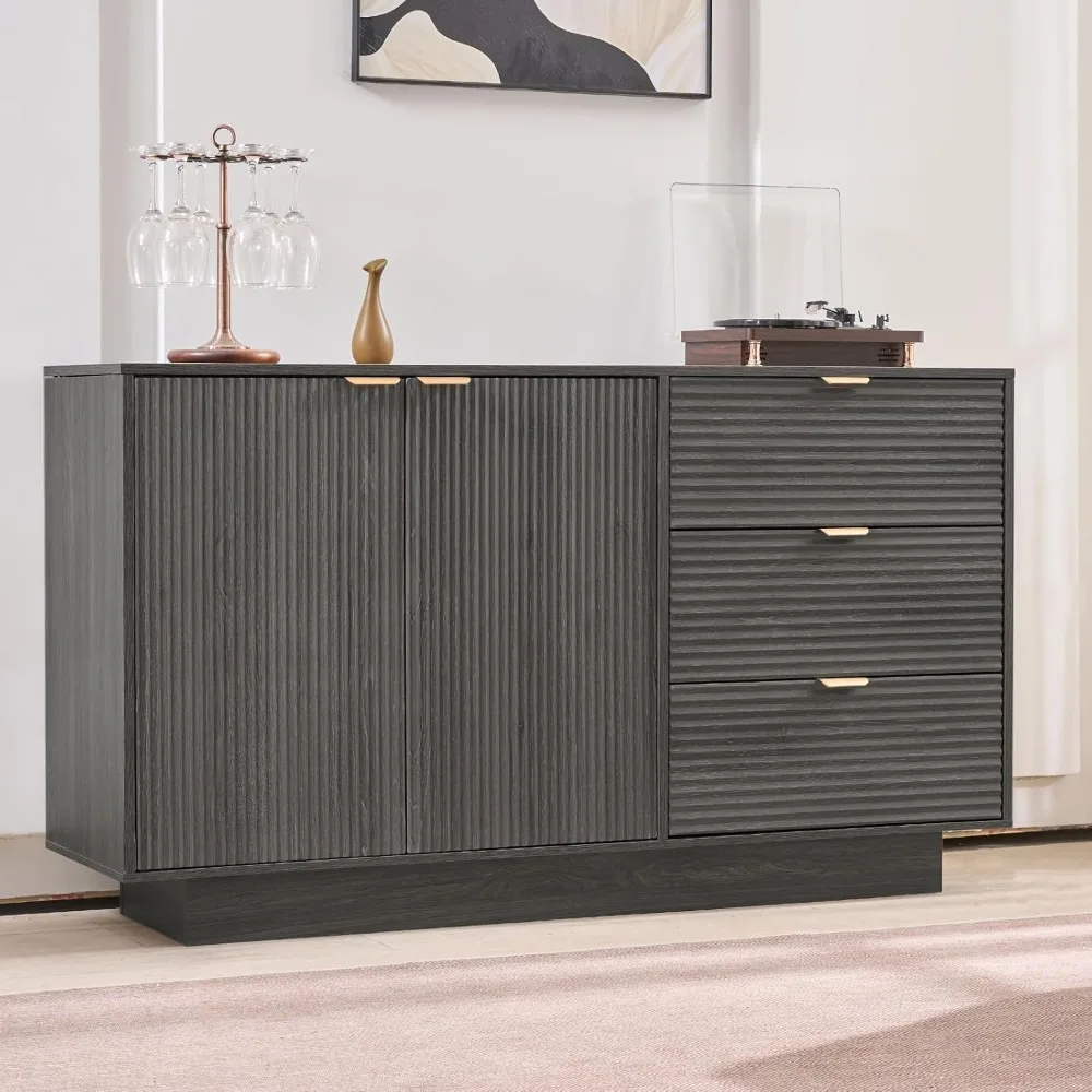 55''Large Fluted Sideboard Buffet Cabinet, Modern Buffet Table Coffee Bar Wine Bar Storage Cabinet with 2 Doors and 3 Drawers fo