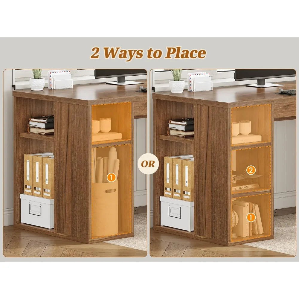 - 【Ample Space】This office desk has a spacious desktop. It features 3 drawers and a 8 open storage cabinet which can accommodate a large number of files, books, and other office essentials. File drawer with full extension slides holds letter or A4 size hanging files. Three additional drawers feature metal runners and safety stops to keep you and your family safe.