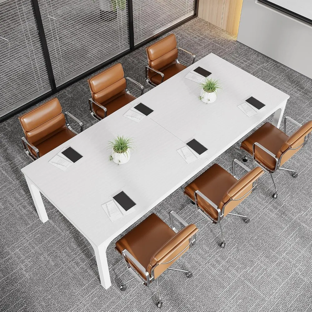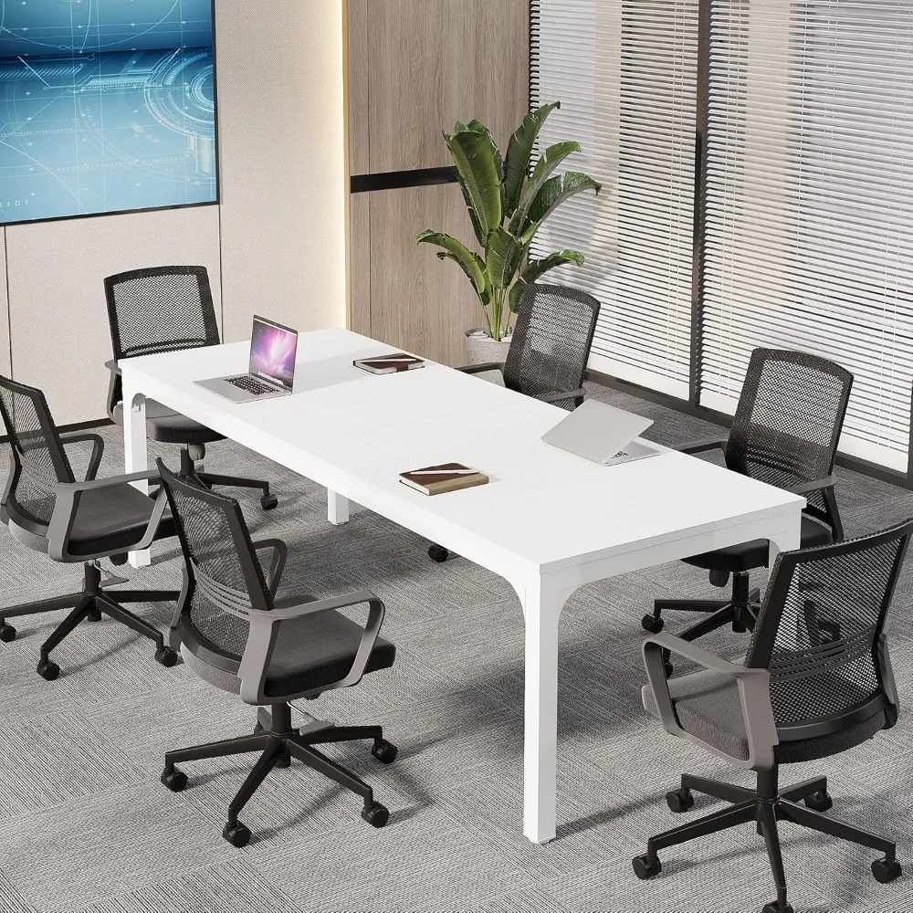 This product is a spacious meeting table with dimensions of 78.74 inches in length, 27.56 inches in width, and 29.53 inches in height, designed to comfortably seat 6 to 8 people for collaborative work, brainstorming sessions, and group projects. It is constructed with a durable 0.59-inch thick particle board top and sturdy 1.97-inch metal legs, ensuring the table's strength and longevity for everyday office use. Beyond its role as a conference table, its size and design make it suitable as an office computer desk for presentations, team tasks, or to extend your workspace. The table is equipped with adjustable foot pads to maintain balance on uneven floors, ensuring stability and preventing scratches, which helps maintain a smooth workflow. Assembly is straightforward with clear instructions and all necessary hardware included, making the process quick and easy.