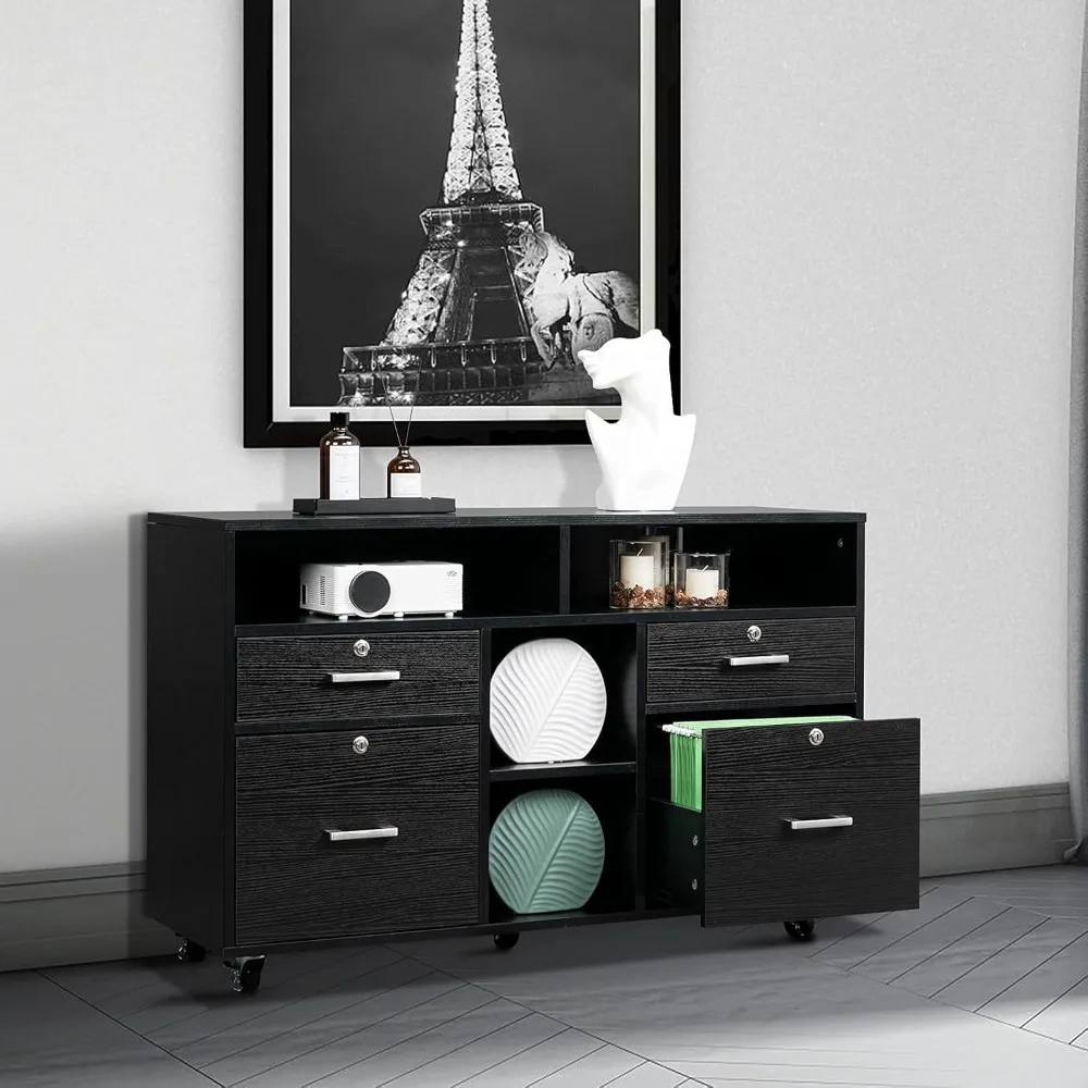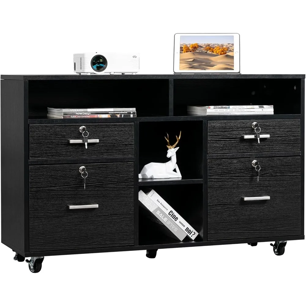 Wood Mobile File Cabinet with 4 Drawers and Shelves, Printer Stand with Open Storage, Locking Lateral Filing Cabinet for